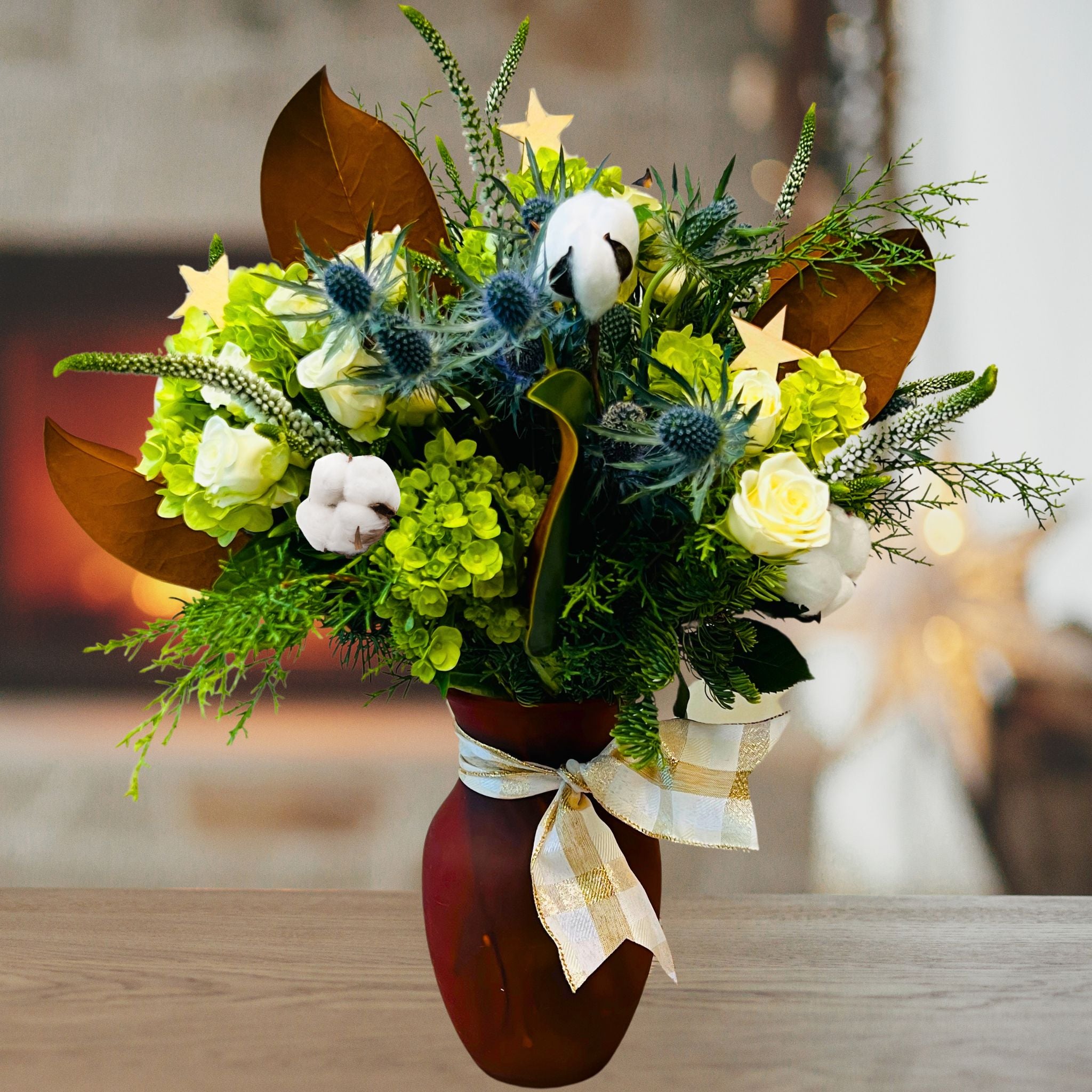 The "Woodland Holiday" bouquet mixes green hydrangeas, white spray roses, blue thistles, and cotton for a rustic holiday vibe. It's finished with wood stars, magnolia leaves, and a plaid ribbon in a frosted vase. Perfect for any celebration!