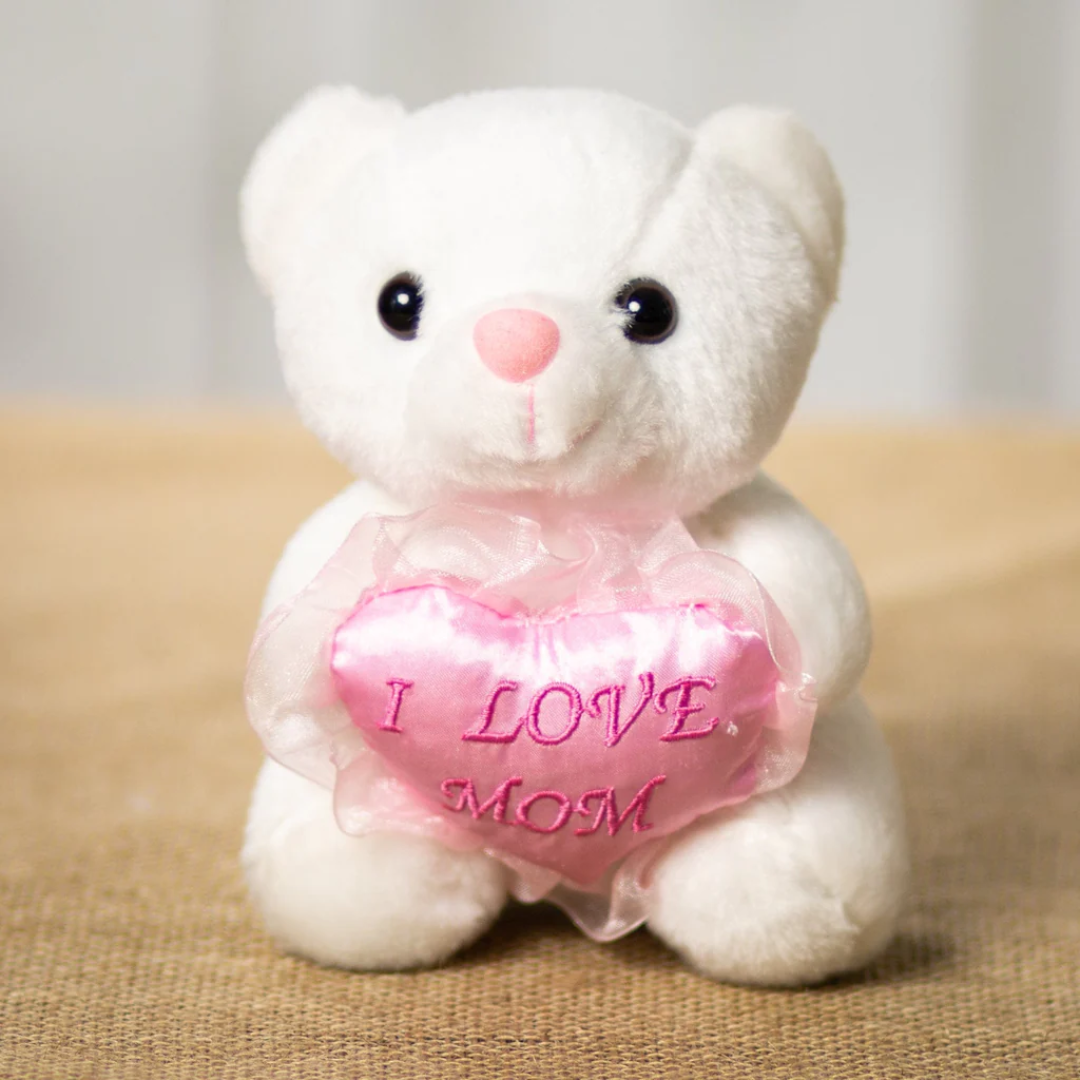 A small white 6" bear with a cute pink nose, holding a pink heart that says "I love Mom".