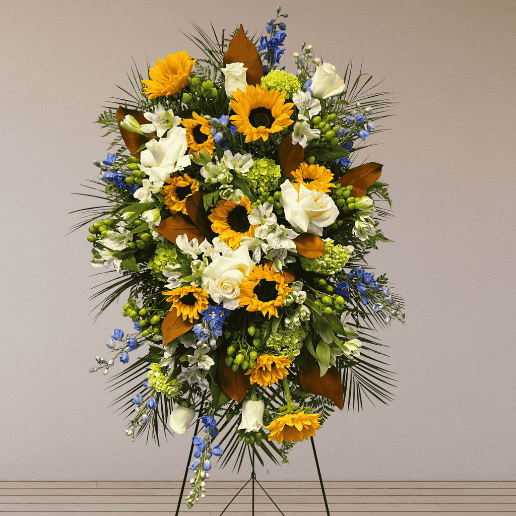 Send a large Funeral Flower Standing Spray custom designed for you or choose from our Standing Spray collection. We can personalize a standing spray for you in the colors of a favorite sports team or by including hobby items like golf balls, fishing gear, knitting needles, playing cards or other symbols of an activity your loved one enjoyed. Add a custom printed ribbon for your personal message to celebrate a life well lived.