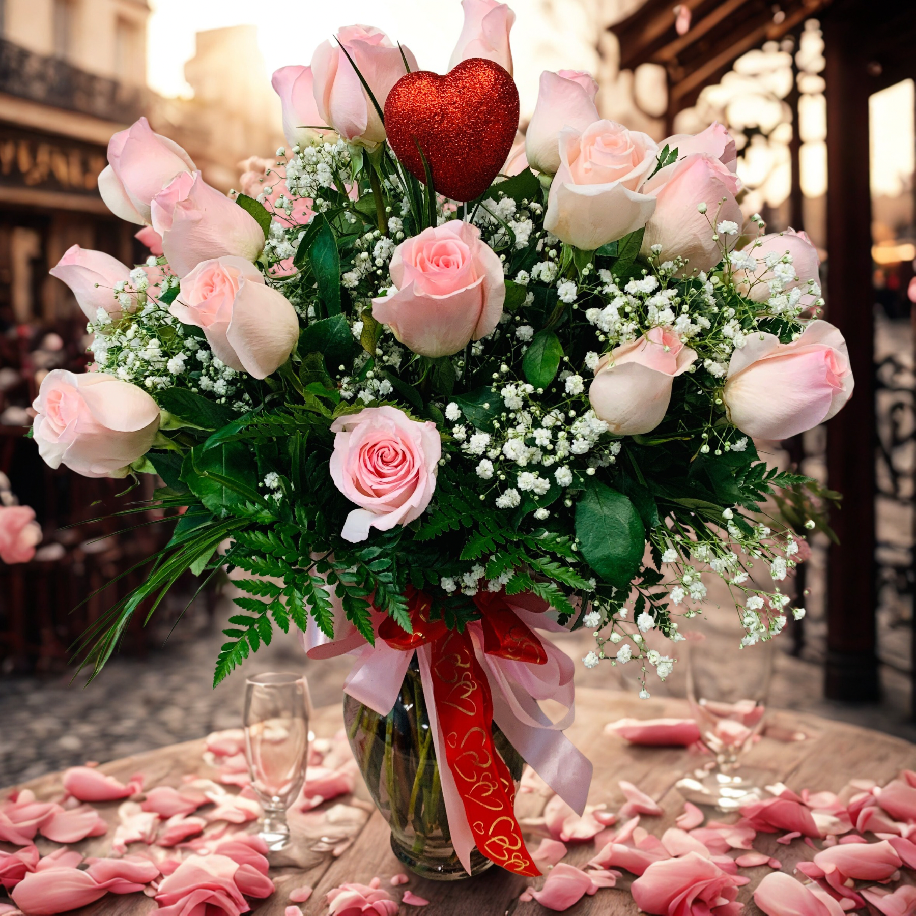 Your recipient will hold these close to their heart. With these grand and beautiful two dozen pink roses in a pink champagne colored vase. Love bubbles up and toasts to all the feelings of perfection and life feels free and pink with joy.