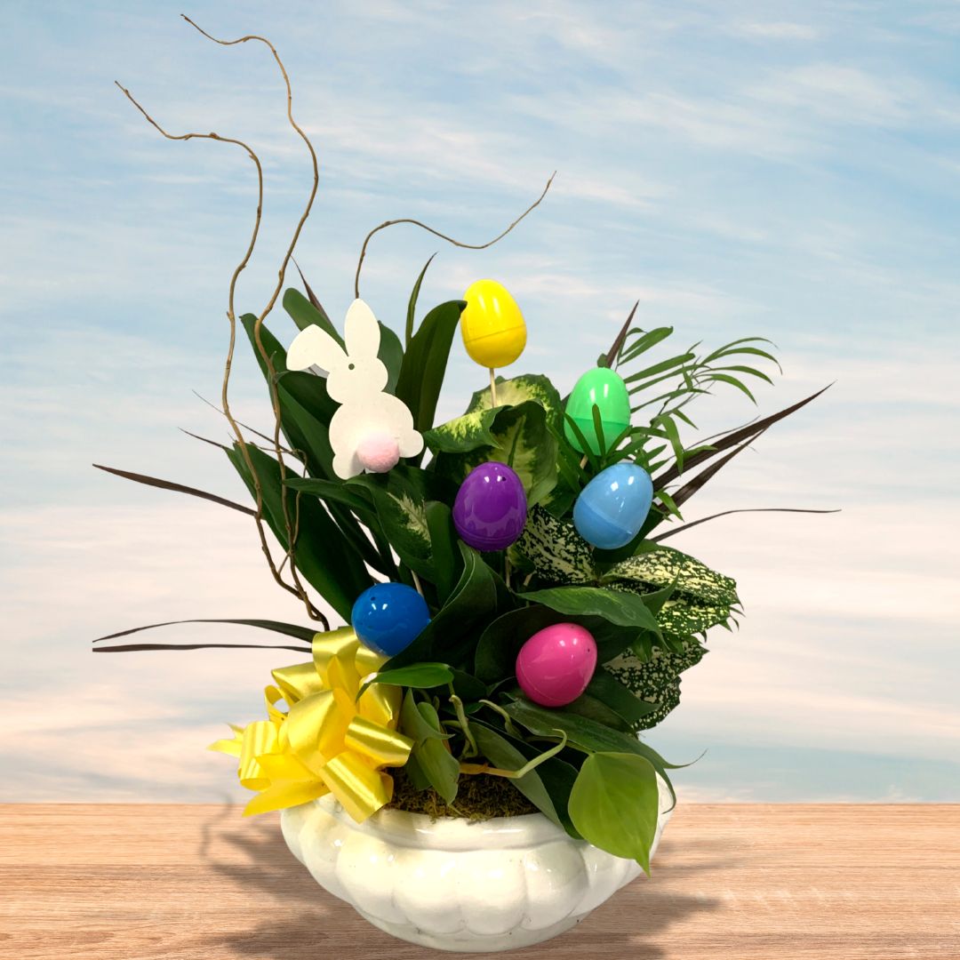 Assorted live green plants in a ceramic container decorated with curly willow, an easter bunny, a bow, and Candy filled Easter Eggs.